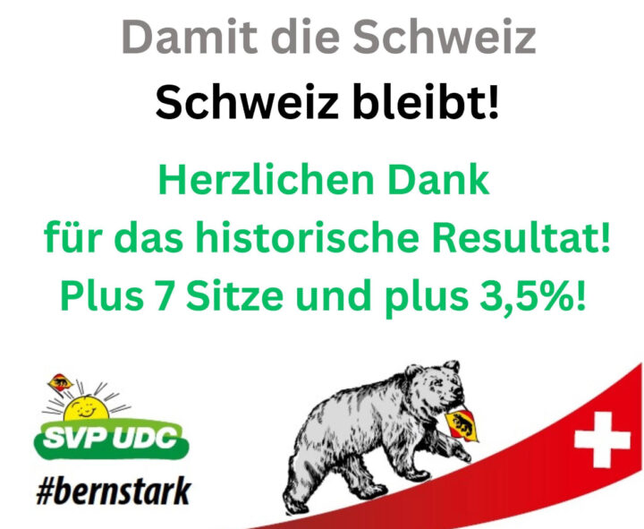 Die bernische SVP ist hocherfreut über die Sitzgewinne im Grossen Rat. Mit 51 (+7) von 160 Sitzen konnte…