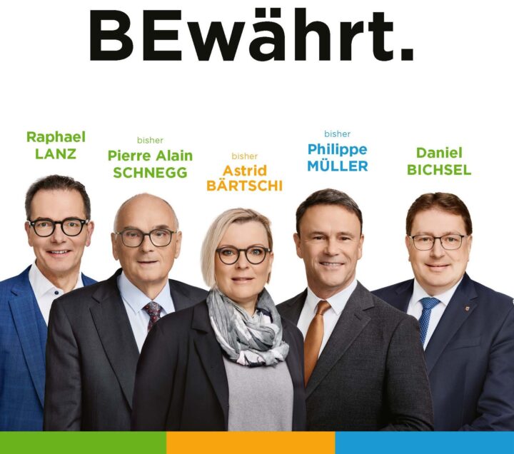 Regierungsratswahlen im Kanton Bern begrüssen zu dürfen: Gleich zu Beginn der Veranstaltung werden Astrid Bärtschi (Die Mitte), Philippe Müller (FDP), Pierre Alain Schnegg (SVP), Raphael Lanz (SVP) und unser Gemeindepräsident Daniel Bichsel (SVP) auf dem Podium von Nationalrat Lars Guggisberg (SVP) befragt.
